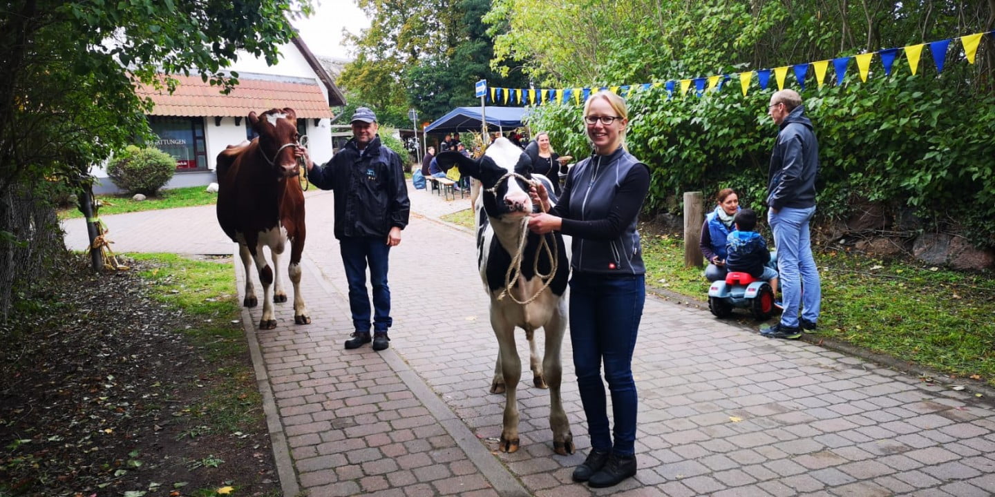 Ganz überraschend kam auch Herr Augustin mit zwei Kühen vorbei und stellte diese auf dem Festgelände vor. Weitere Stände sicherten die Versorgung der Besucher mit allerlei Köstlichkeiten. Die Landfrauen, der Frauenkreis, Frau Buchholz, der Buddhismusverein, Cateringservice Erdmann und das Team vom Stettiner Hof hatten sich gut vorbereitet, um die Besucher zu verwöhnen. Verkaufsstände vervollständigten das Fest. Biohof Koppe, der Imkerverein, Keramik Büttner, der Glockenverein, Holzarbeiten von Frau Kohn, Strandgut Lietz und der Blumenverkauf Frau Jahnke boten ihre Produkte an. Wir würden uns freuen, wenn alle Gäste des Festes davon berichten, damit auch diejenigen, die dieses Mal den Weg dorthin nicht gefunden haben, im nächsten Jahr dabei sind. Eine kleine Gemeinde wie unsere lebt auch von der Begegnung der Einwohner. Und wo gäbe es eine bessere Möglichkeit zum Treffen, zum Klönen und zum Gedankenaustausch als gerade auf solchen Veranstaltungen.